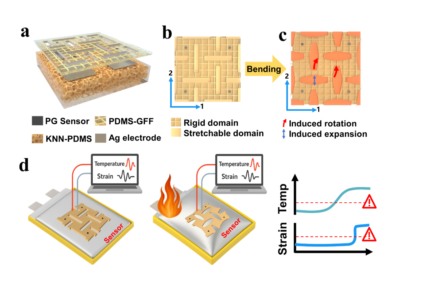 随着新能源汽车、可穿戴设备和大型储能电站的快速发展,锂离子电池的安全监测成为亟待解决的关键问题。电池在工作过程中会经历显著的热–力耦合变化,如热量堆积、气体析出引起的鼓胀、电极结构形变等,这些早期迹象往往预示着潜在的热失控风险。因此,需要一种能够同步监测温度与形变的多模态传感技术,实现电池健康状态的实时评估。然而,现有柔性传感器在双参量检测中普遍存在信号串扰,并在高温环境下易失效。为实现有效解耦,目前不少方案依赖复杂的电路补偿或机器学习算法,但随之带来能耗高、硬件体积大等问题,难以满足电池系统对长期稳定性和低功耗的严格要求。