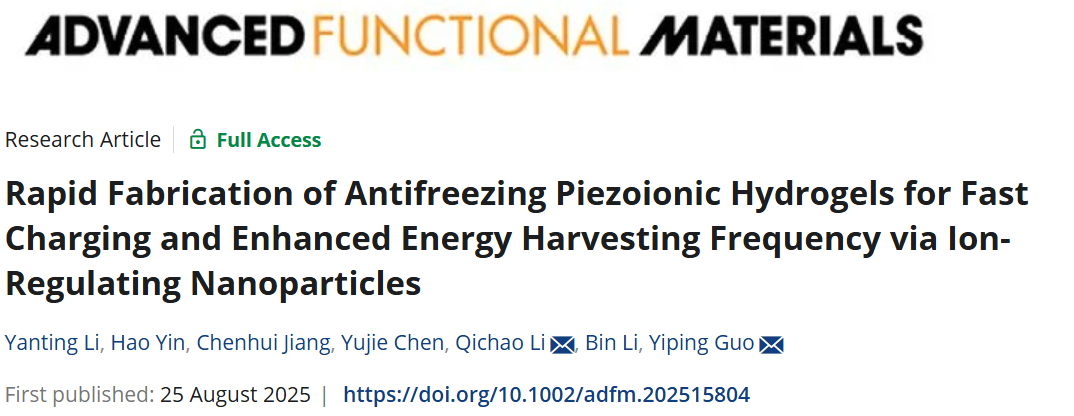 近日,厕所偷拍 金属基复合材料全国重点实验室郭益平教授课题组在柔性能量收集器件领域再获重要突破。其最新研究成果以 “Rapid Fabrication of Antifreezing Piezoionic Hydrogels for Fast Charging and Enhanced Energy Harvesting Frequency via Ion-Regulating Nanoparticles” 为题,正式发表于国际著名材料期刊《Advanced Functional Materials》(DOI: //doi.org/10.1002/adfm.202515804)。